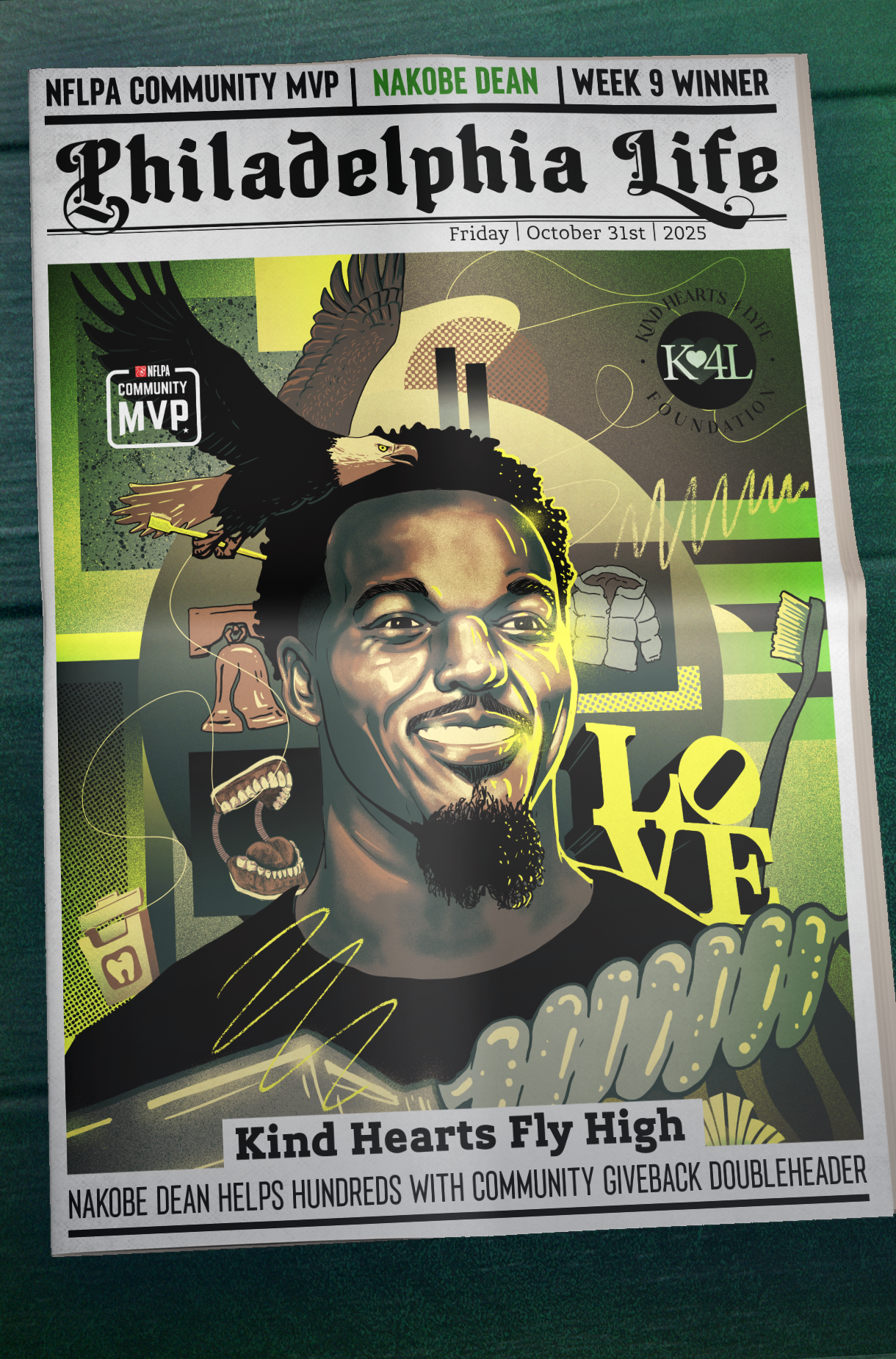 Nakobe Dean led his Community Giveback Doubleheader Week in Philadelphia, providing free dental care for students and donating 1,000 winter coats, meals, and health services to families in need.