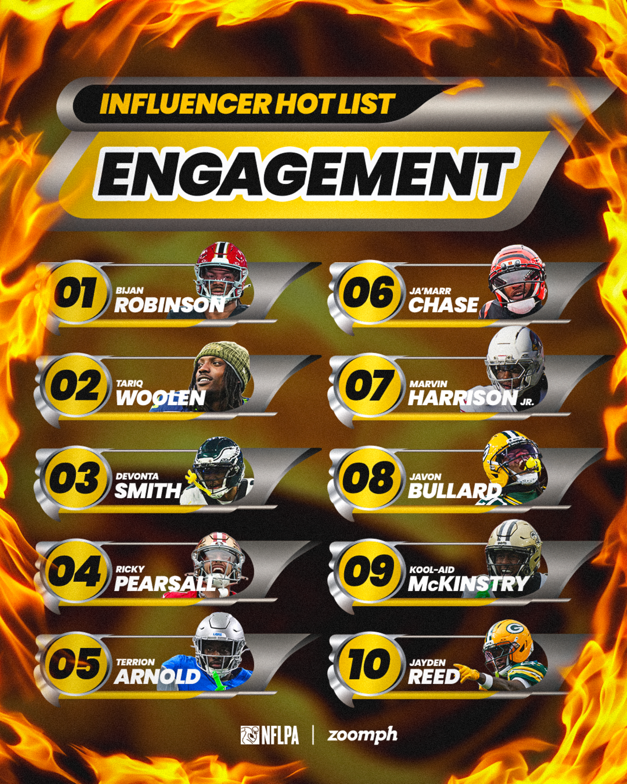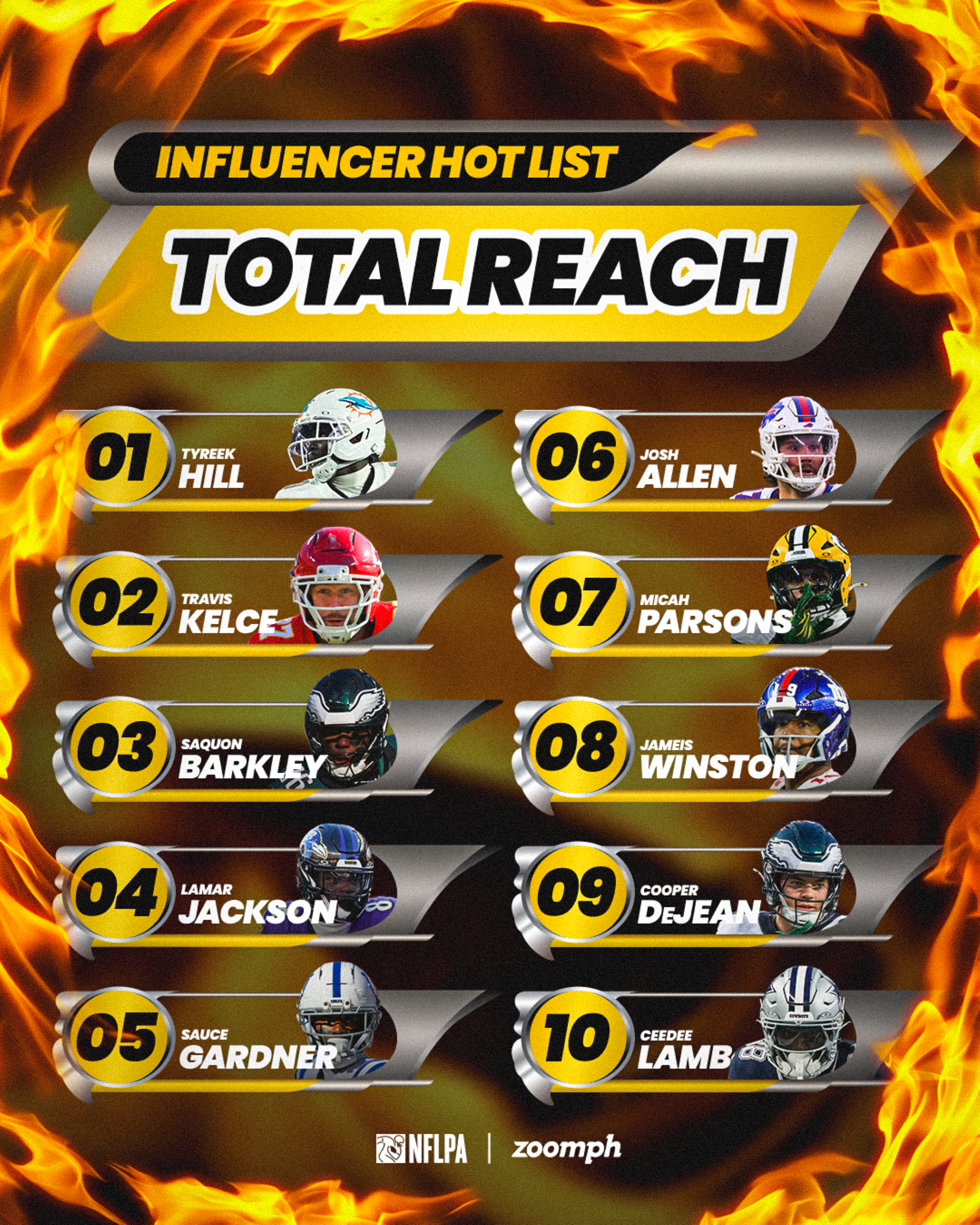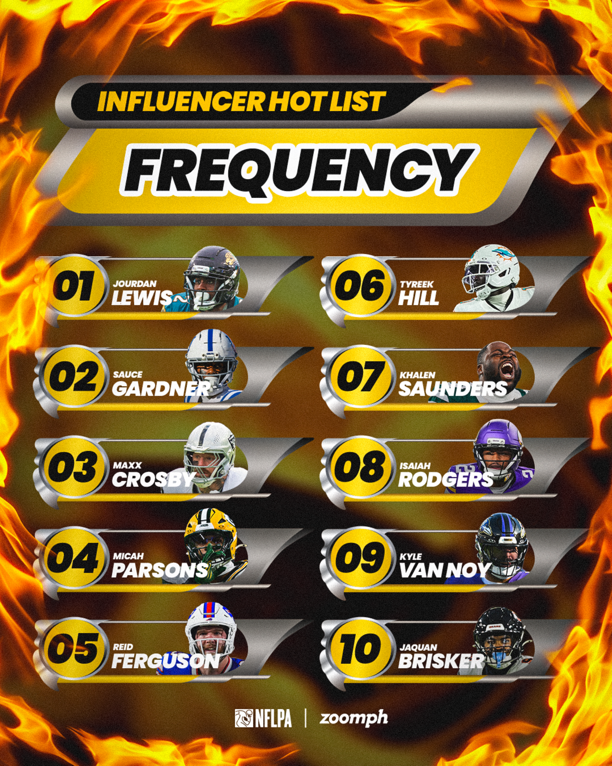 The NFLPA Influencer Hot List, powered by Zoomph, is designed to help marketers and brands gain a deeper understanding of the impact and influence NFL players have on social media. Leveraging a proprietary Social Marketability Index, the NFLPA and Zoomph collaborate to build this annual list by analyzing a wide range of social metrics for active players across the league.